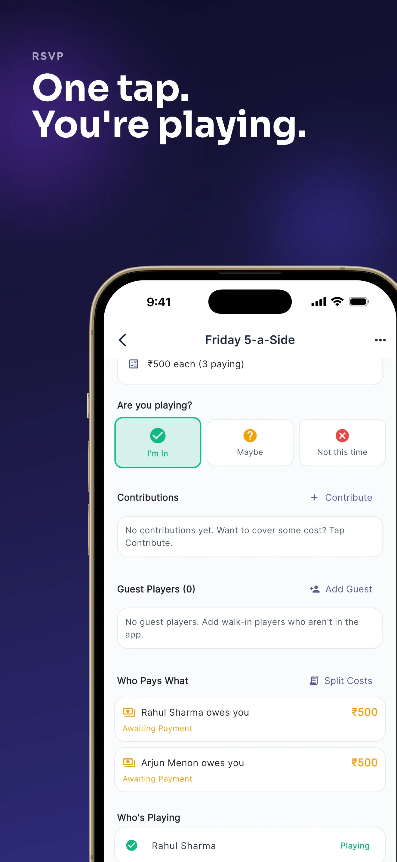 Organize group sports games, track RSVPs, and split costs fairly. No more awkward money conversations or spreadsheet chaos.